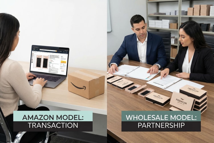 This page is a business-focused comparison of Amazon versus a wholesale lash supplier, written for professional buyers including large beauty institutions, wholesalers, distributors, e-commerce sellers, salons, and lash academies.