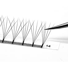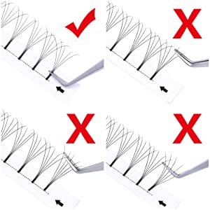 The tip of the tweezer should keep level with the lash strip, grab 0.8-1.5 mm part from the fan’s root, then pull them up.